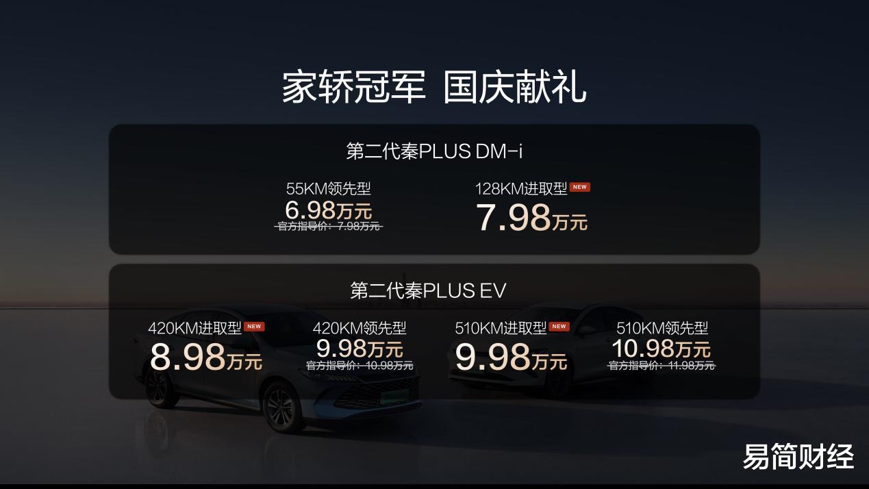 9月25日,比亚迪第二代秦PLUS双车上新,发布了秦PLUS DM-i 128KM进取型、秦PLUS EV 420进取型、510KM进取型等三款新车,加强紧凑型家轿市场布局,同时全系车型享国庆献礼价,限时6.98万元起。
