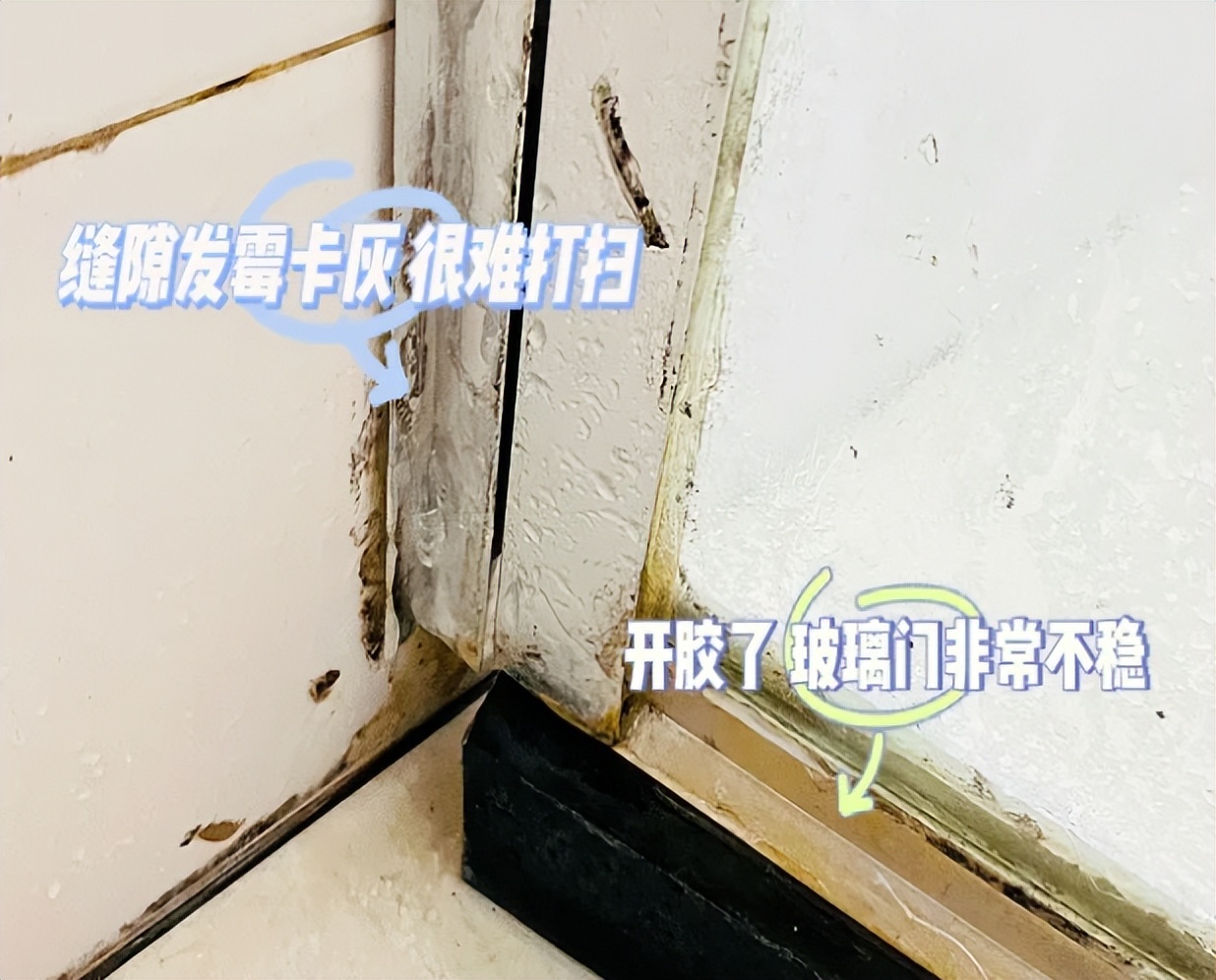 往顽固水渍就像是吸附在玻璃上一样,底部缝隙还会有发霉、发黄的情况,严重还会产生发霉的味道。