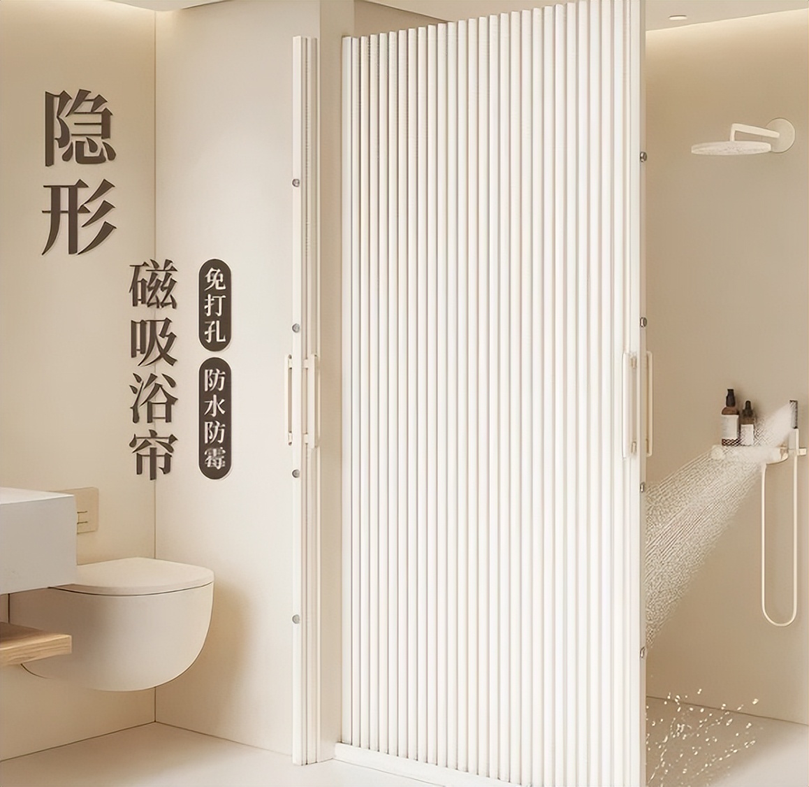 隐藏式浴帘就像推拉门的方式,在上面或者下面做一个轨道,浴帘就嵌入在里面,不用的时候直接拉到靠墙的位置上,不会有任何突兀。