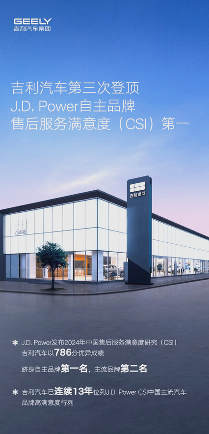 吉利售后服务的卓越表现,获得了行业权威的广泛认可。2024年,吉利以786分登顶J.D. Power中国售后服务满意度研究自主品牌第一。此外,吉利汽车已连续16年斩获中国汽车服务金扳手奖品质服务奖。从德国TÜV莱茵服务认证到连续12年稳居J.D. Power主流品牌高满意度行列,吉利用权威认证与用户口碑构建起行业标杆。在2024年中国汽车服务金扳手奖评选中,吉利荣获“年度客户体验奖”,这是行业对其服务品质的又一次肯定。同时,吉利在2023年中国汽车售后服务客户满意度调查(CAACS)中位居自主品牌榜首。