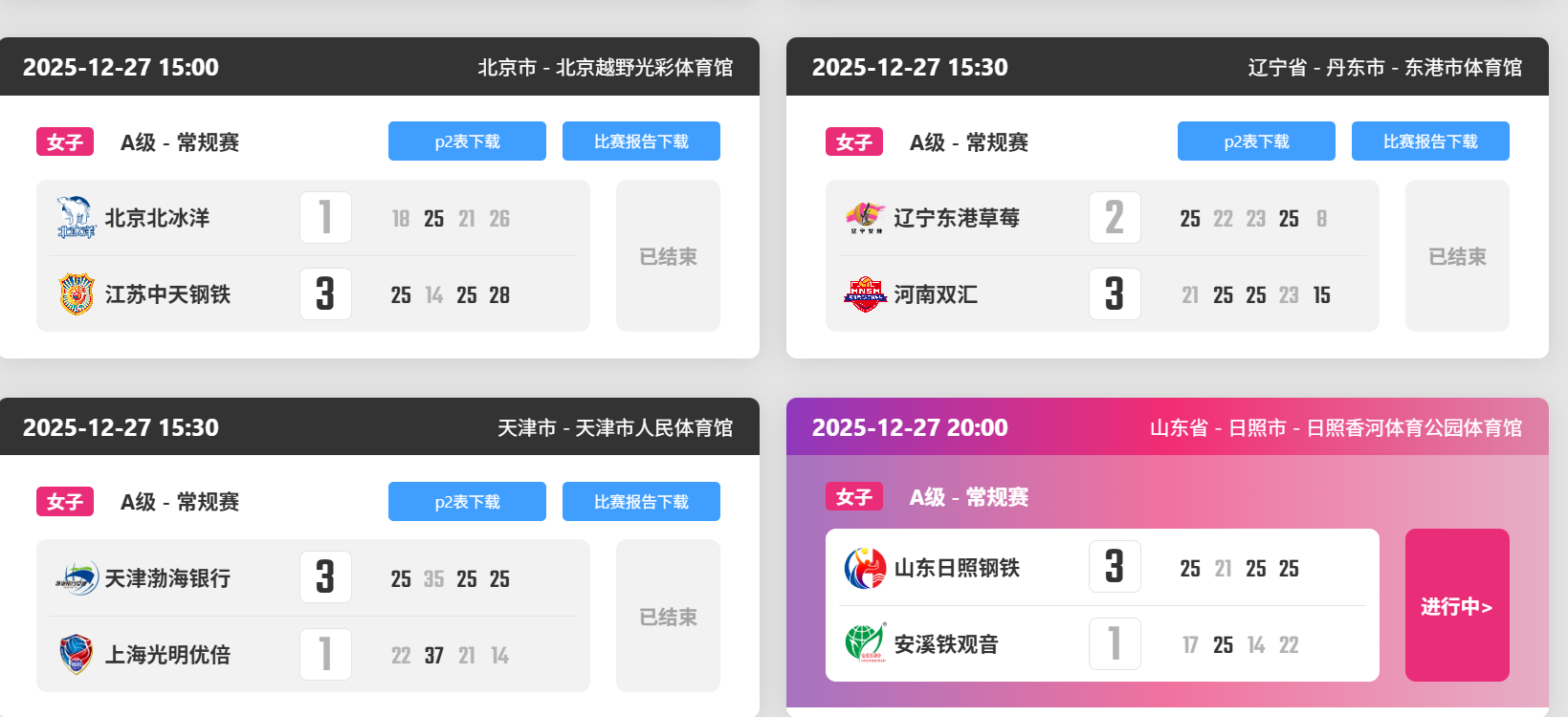 【A级】天津3-1上海(25-22、35-37、25-21、25-14):赛前上海四连胜只丢了1局,本场比赛却爆出大冷,上海只在第二局的超长对峙阶段拿下一局,其余三局都输球,第四局更是惨败。赛后,天津女排3胜2负积9分;上海女排4胜1负积12分,遭遇赛季首败。