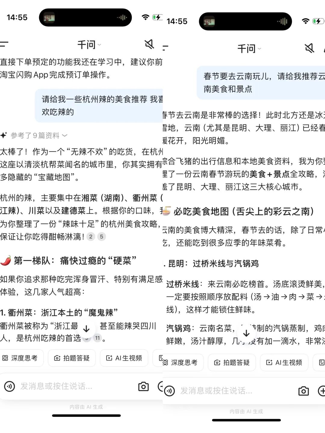 其中尤为关键的是记忆与个性化能力的缺失。测试中,在提前告知“喜欢吃辣”的偏好信息后,后续几轮对话后未能被有效提取和运用,AI仍以通用模式进行推荐。显然,千问在用户关注的上下记忆调取的功能上还有一定的进步空间,“个人助理”的这一点得以完善,或许将极大缩小千问大体系想实现的用户长期依赖目标。