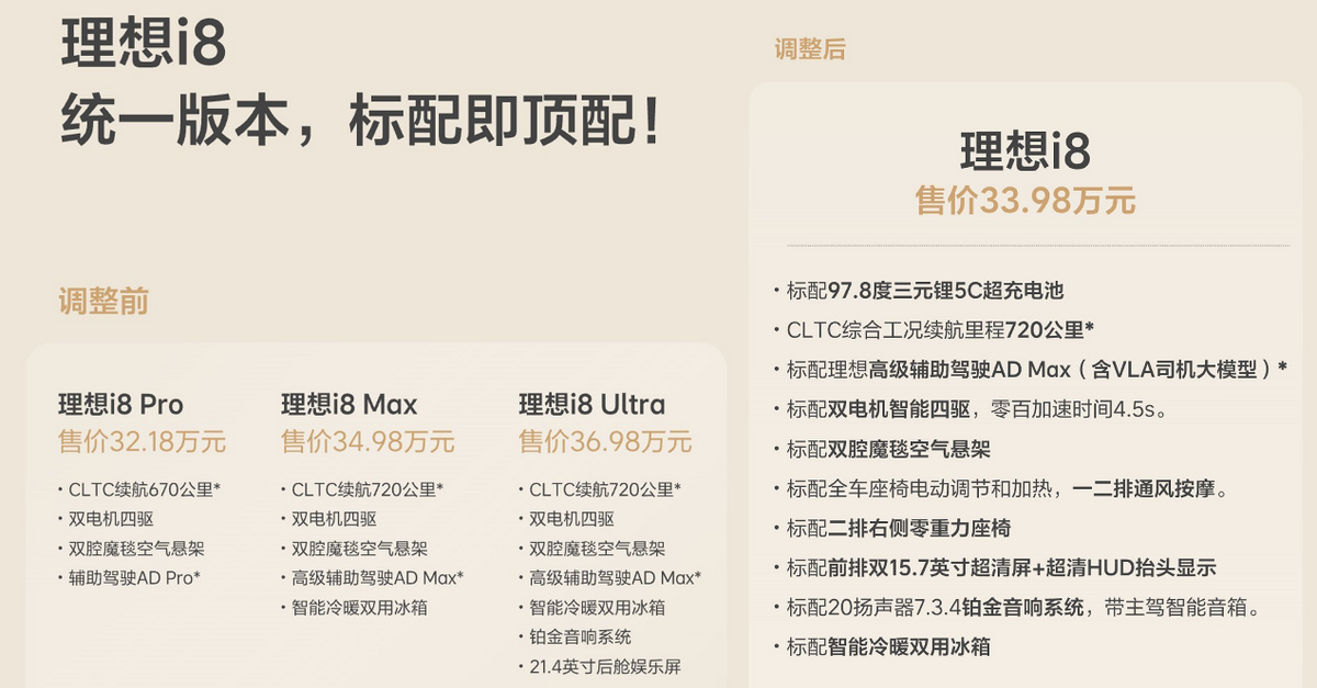 没想到,新车上市才一周,理想就对理想i8进行了配置调整:由三个改为一个,取消 Pro和Ultra版本,并以理想i8 Max为标准配置;原购车权益中的二排舒享套装(二排右侧零重力座椅、侧窗遮阳帘、双侧小桌板)和VLA司机大模型成为标准配置;售价也从34.98万元调整为33.98万元;原来以36.98万元选择Ultra版本的用户,只需要34.98万元的价格,就可实现原选择的全部配置;并且新增后舱娱乐屏套装选项(价格1万元),以满足部分用户的需求。