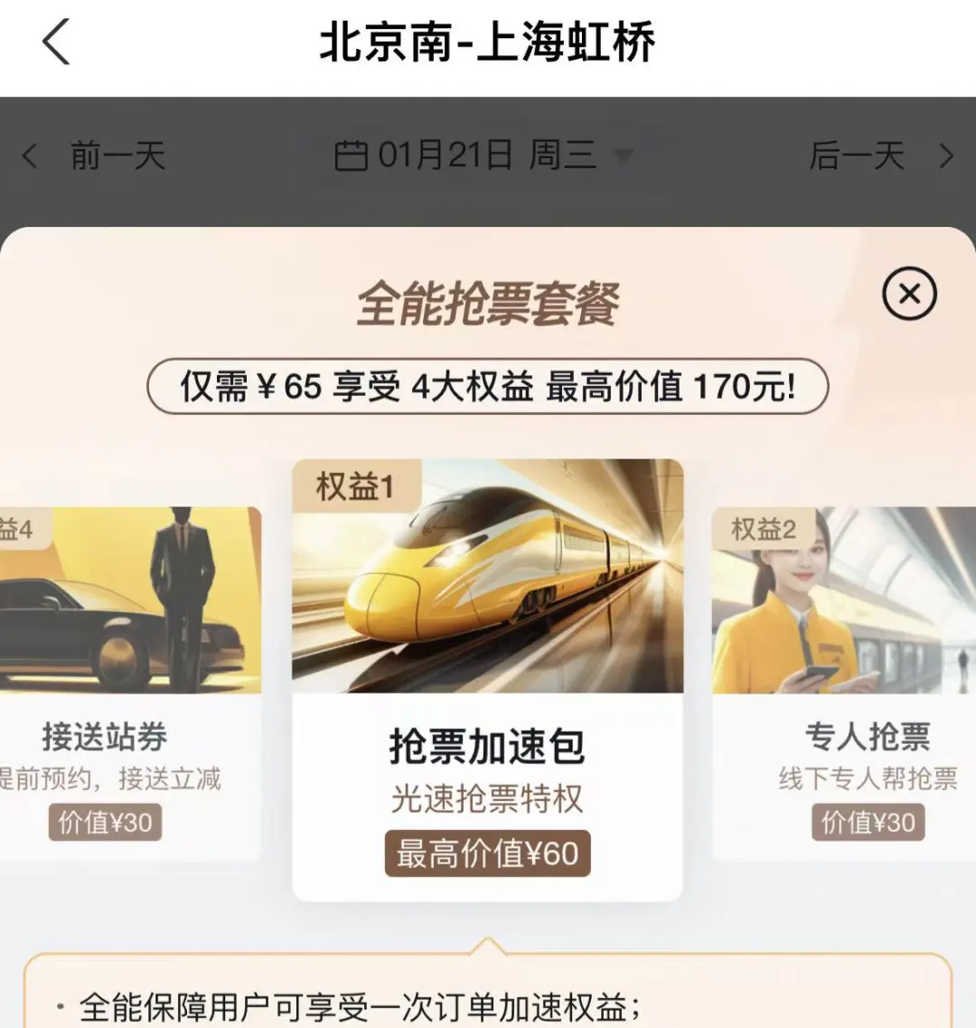 甚至每到出行高峰,有大量的第三方平台会打出“专属权益”“专人抢票”“急速抢票特权”“VIP抢票”……等等字眼来让用户购买高价加速包。