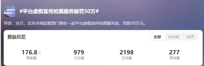 更夸张的还会标注“独家技术”“独享抢票渠道”等等宣传字眼……而就是这样的操作,让这些平台每年从老百姓的口袋中薅走几十亿!这一数据并非空穴来风,有数据显示,早在五六年前,某平台火车票抢票服务的净利润就已经过亿了。要知道这还是去除各种成本的净利润,结合市面上有十多家这样的抢票平台,少说它们一年要薅走老百姓几十亿。那么这种所谓的独家技术、独享渠道……真的有用吗?12306官方也是多次强调声明,所有的加速抢票服务都是骗局,但每年,还是有大量的人去购买这些服务。有调查数据显示,超半数受访者购买过高峰期加速包服务!虽然官方屡次声明不存在这种服务,但平台依然在宣传,而消费者依然在相信。不过,今日一条热搜话题,再一次打破了消费者这个“付钱就能享受”特权的美好梦境,该热搜话题是——某平台虚假宣传抢票服务被罚了50万。