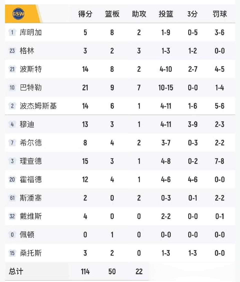 双方球员数据勇士队6人得分上双!巴特勒表现出色,投篮15中10,砍下最高分21分9板7助的准双,理查德贡献15分3板1助,波斯特14分8板2助,波杰姆斯基14分6板,穆迪13分3板1助,霍福德12分4板,希尔德8分4板2助,库明加5分8板2助,戴维斯4分,格林和桑托斯各得3分,斯潘塞2分2助,但整体表现可圈可点!步行者4人得分上双!内姆哈德14分2板9助的准双,赫夫12分11板2助的两双,杰克逊12分6板,整体表现不尽人意!