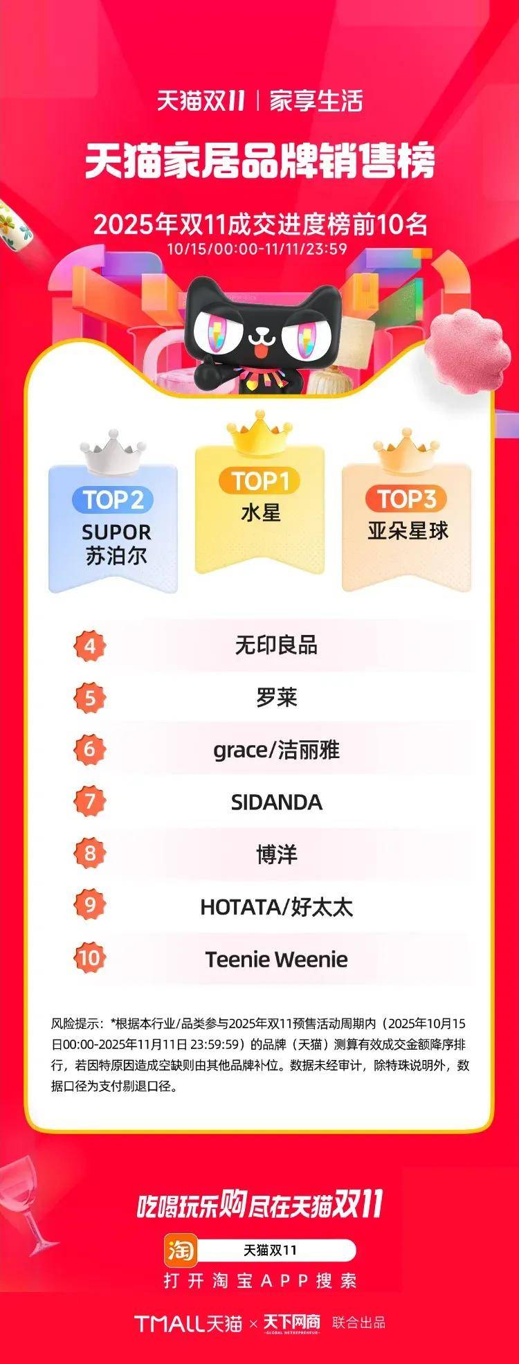 而在天猫家居品牌销售榜方面,TOP3的位置则被水星、苏泊尔、亚朵星球占据,涵盖了家纺、厨电、居住体验多个热点品类,为家享生活行业的整体增长贡献强劲动力。