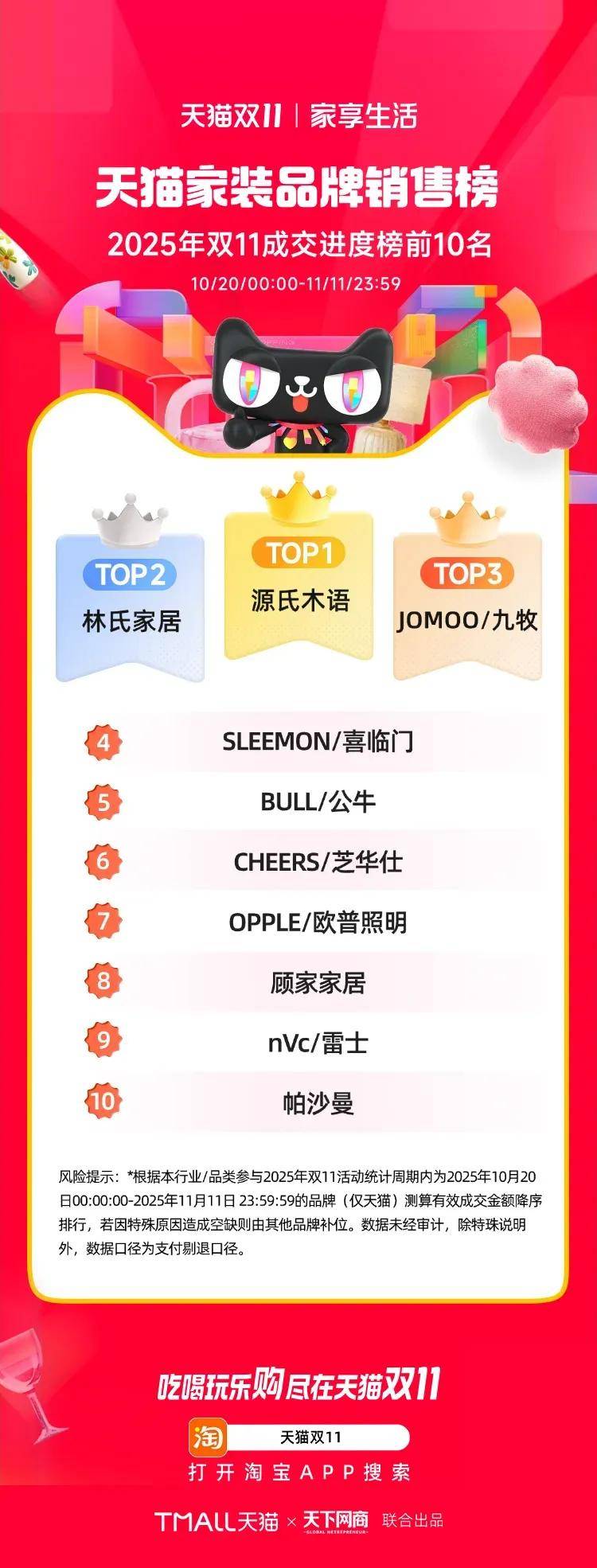 在天猫家装品牌销售榜里,源氏木语、林氏、九牧位列前三,凸显了消费者对品质家具与生活空间设计的持续关注。