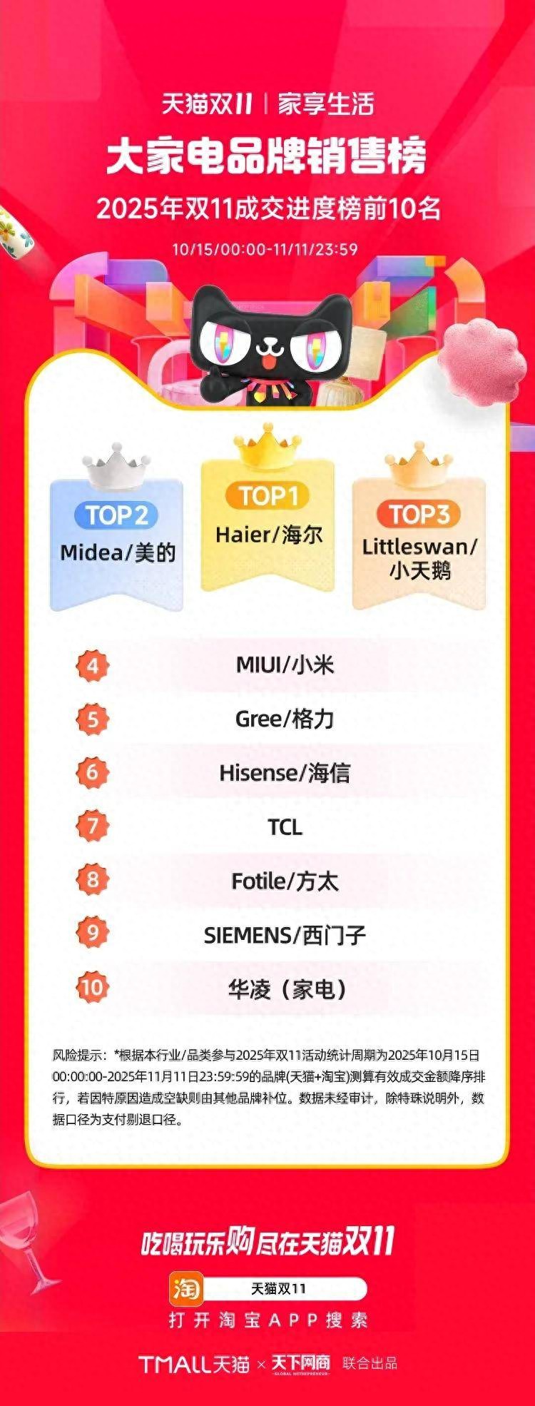 在大家电品牌销售榜方面,海尔、美的、小天鹅稳居前三,小米强势冲进前四;今年新上榜的方太、西门子、华凌也展现出明显的上升势头,竞争格局更加多元。