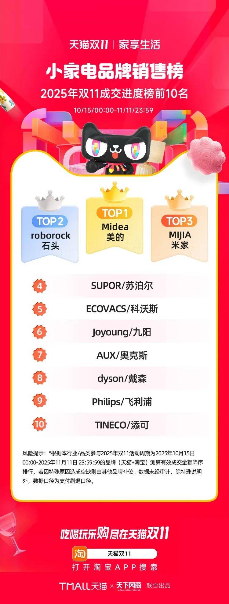 在小家电品牌销售榜中,美的、石头、米家包揽前三,延续了在智能、生活类电器的领先优势。