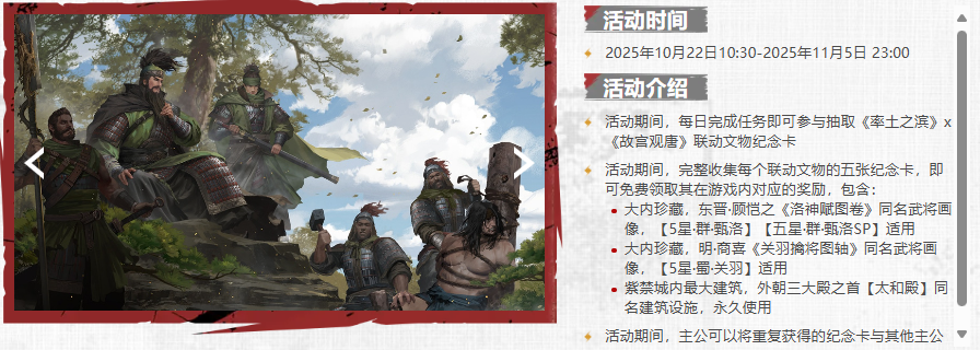 包括《洛神赋图卷》、《关羽擒将图轴》这些国宝级画作也被联动复刻到游戏中,最重要的是,这些联动皮肤、画像一律免费!不需要玩家花一分钱,只要完成对应的文化联动任务即可免费领取,永久使用!