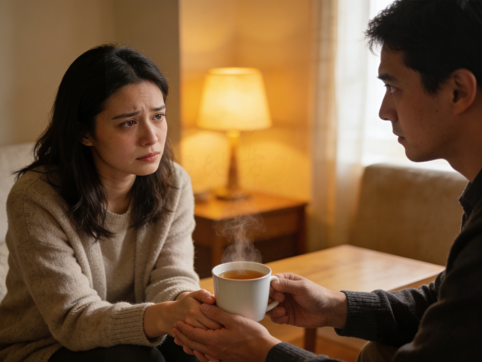 别讲大道理,先握住她发抖的手,递过去一杯不烫口的温茶。