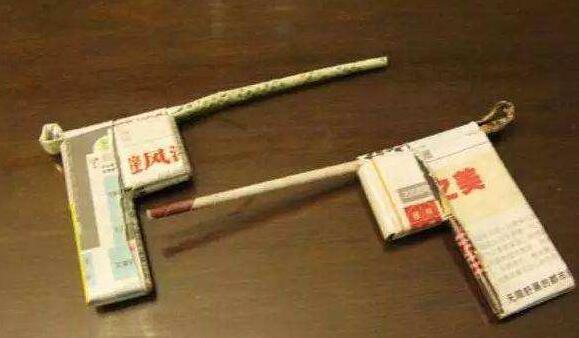 我们小的时候上学,那会儿的老师还没有禁止带玩具去学校。毕竟农村孩子可玩的东西不多,所谓玩具基本上也都是自己自制的。“枪”的制作工艺也不复杂,拿一张纸卷起来就是“枪管”,再拿一张纸,折成方形就是“枪身”,还拿一张纸折成三角形就是“枪把”,一把“枪”就完成了。稍微有点追求的孩子,就会用两张纸来折“枪”的三大部位。再有点品质要求的孩子,会用美术书的封面做“枪身”。一方面是因为美术书的封面是过塑了的纸,好看又厚且防水,另一方面是其它的书不敢撕,只有美术是没有老师而且从来不上的。