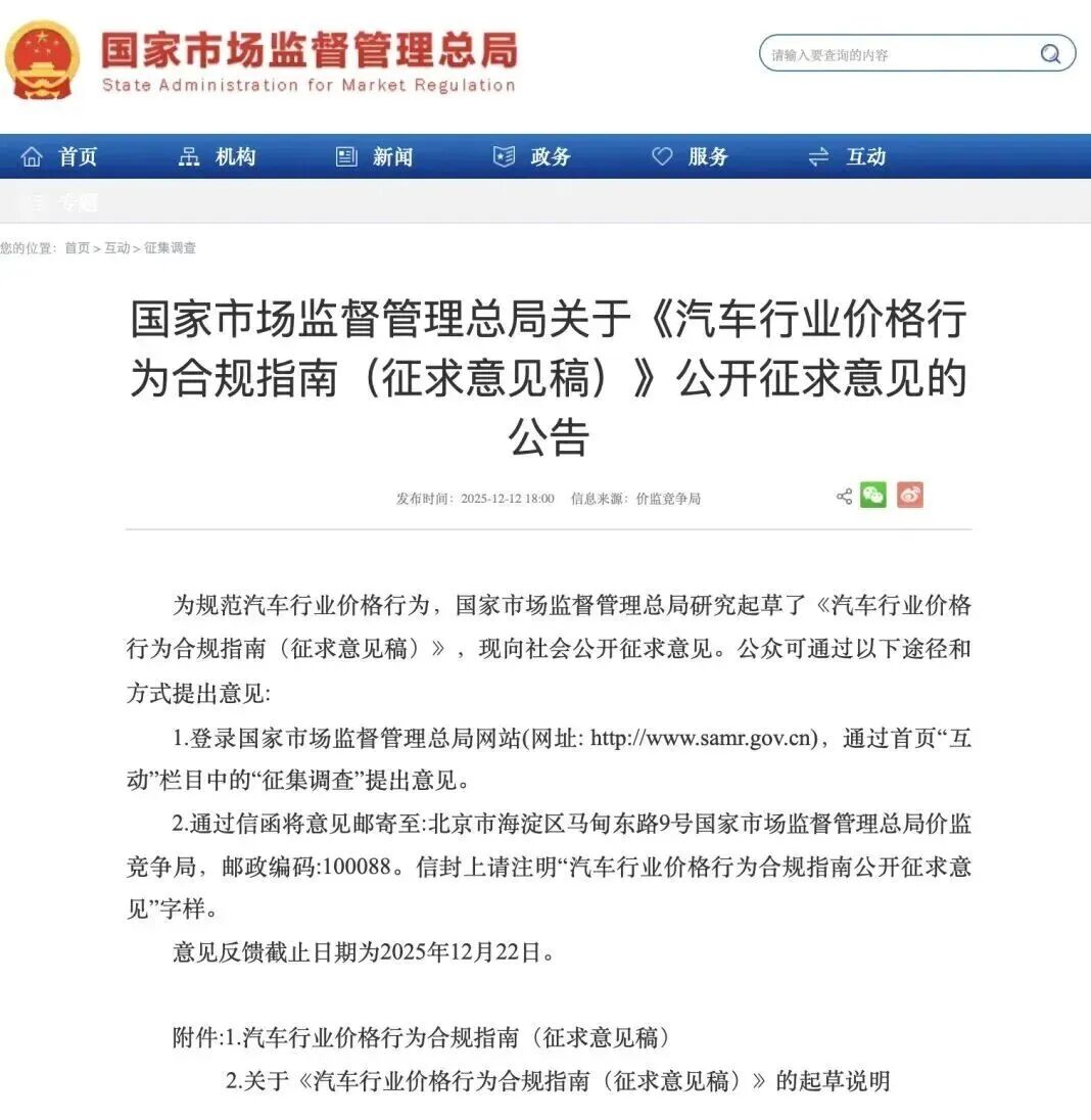 国家市场监督管理总局发布《汽车行业价格行为合规指南(征求意见稿)》,规定车企除依法降价处理积压商品外,不得以其他方式使出厂价低于生产成本;强制明码标价,须显著标示车辆配置、价格、促销规则,严禁价外加价;销售方须在合同内写明具体交付日期,违约担责。