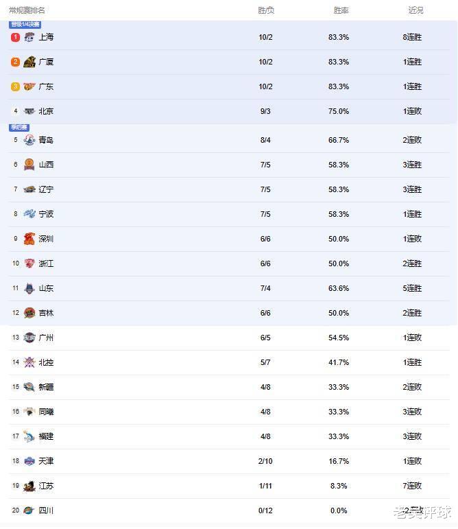 看下积分榜的情况,上海、广厦和广东都是10胜2负,排在前三位。排在第四位到第八位的球队分别是北京、青岛、山西、辽宁和宁波队。而辽宁队苦主四川队已经遭遇12连败,排名垫底。