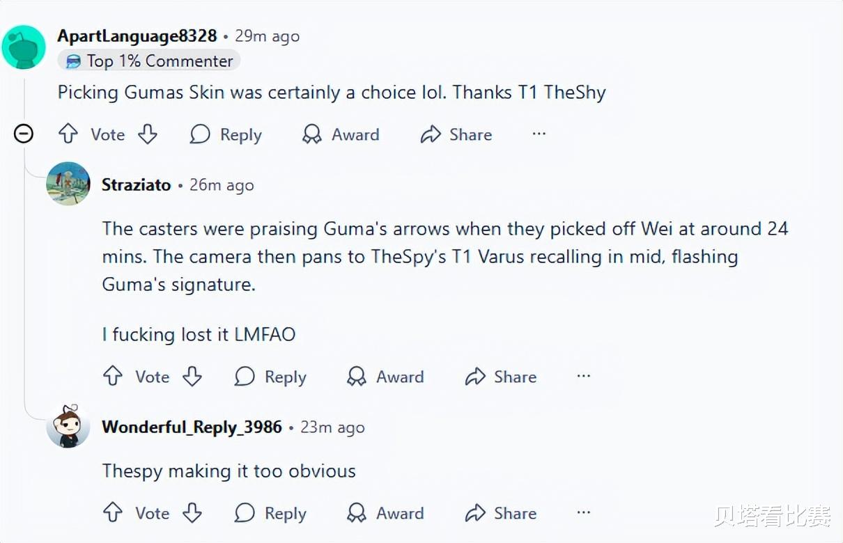 -大约24分钟时,gumayusi抓掉Wei,解说们正在夸赞他的箭。镜头随后转向TheSpy的T1韦鲁斯,他正在中路回城,闪现出Guma的招式。
