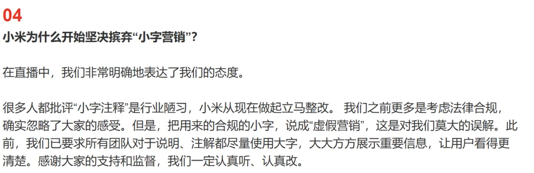 很多人都批评“小字注释”是行业陋习,小米从现在做起立马整改。 我们之前更多是考虑法律合规,确实忽略了大家的感受。但是,把用来的合规的小字,说成“虚假营销”,这是对我们莫大的误解。此前,我们已要求所有团队对于说明、注解都尽量使用大字,大大方方展示重要信息,让用户看得更清楚。感谢大家的支持和监督,我们一定认真听、认真改。