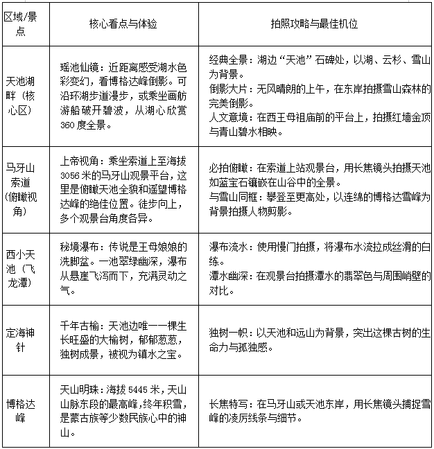 成功免票入园后,搭乘区间车盘山而上,约30分钟后,那片魂牵梦萦的圣湖便豁然眼前。天池景区远不止一个湖,它是一个立体的生态与文化博物馆。