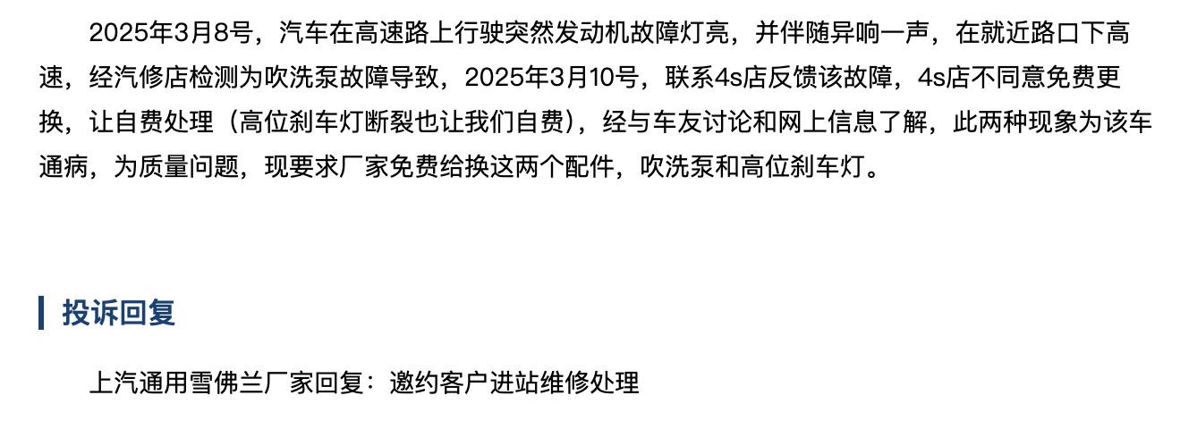 老款车方面,一位迈锐宝XL 2019款 Redline 550T 自动 锐动版车主反映该车的高位刹车灯断裂厂商称要求车主自费处理,此后该车的吹吸泵也发生故障,厂商也要求自费处理。经过网上信息了解,该车主称这两种现象均为该车通病,该车主要求厂家免费更换高位刹车灯和吹吸泵两个配件。对此上汽通用雪佛兰回复称将会邀约客户进站维修处理,但究竟需要车主自费处理还是免费更换,上汽通用雪佛兰并未给予明确回复。