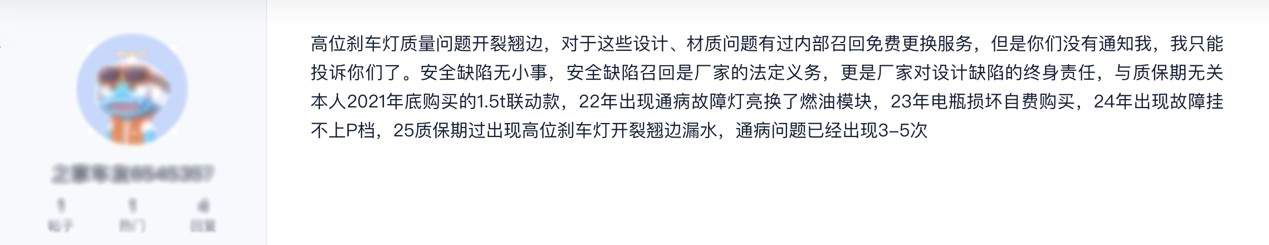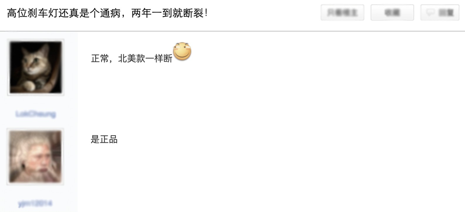 除了迈锐宝XL,上汽通用旗下的别克君威也出现了不同程度的高位刹车灯断裂问题。