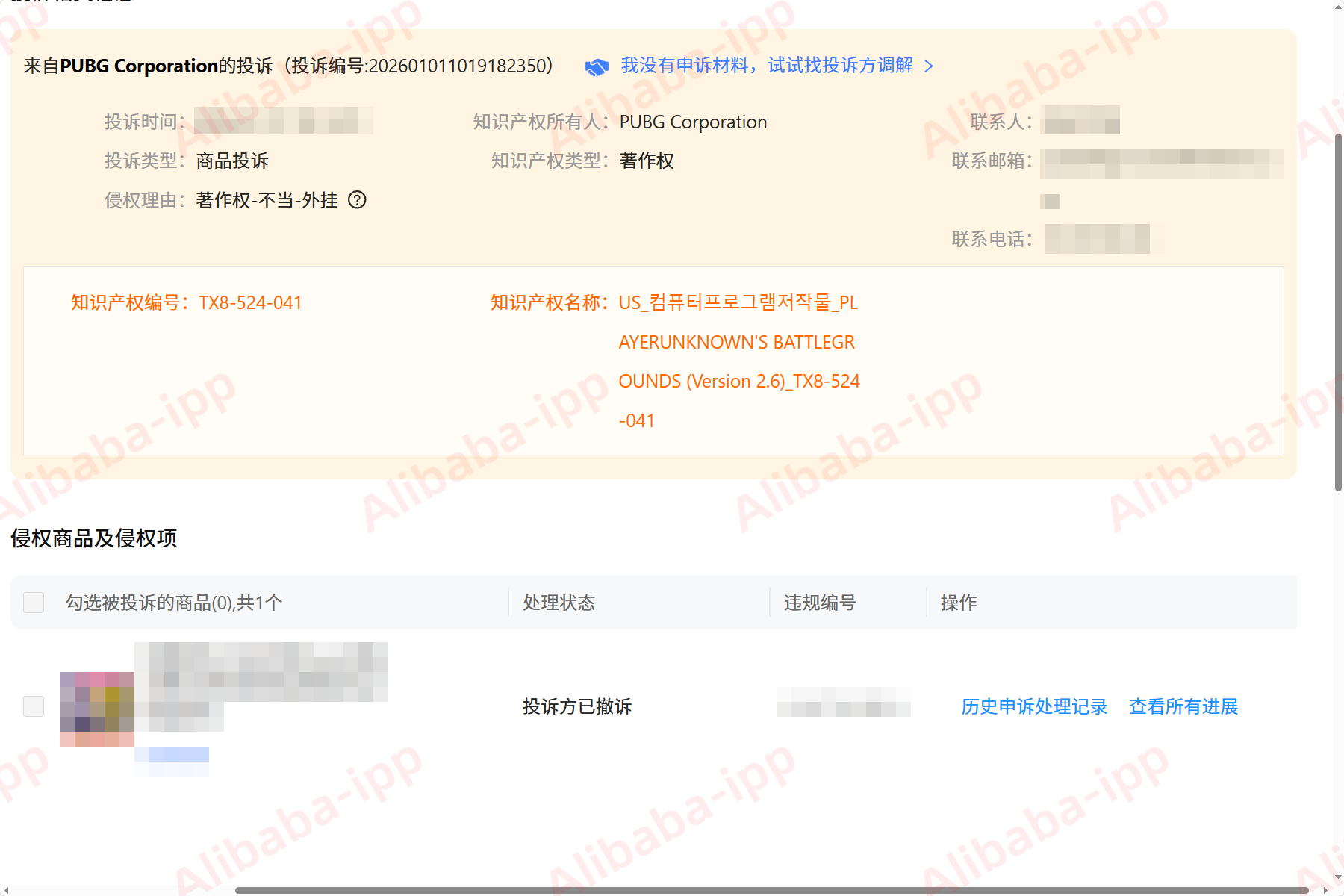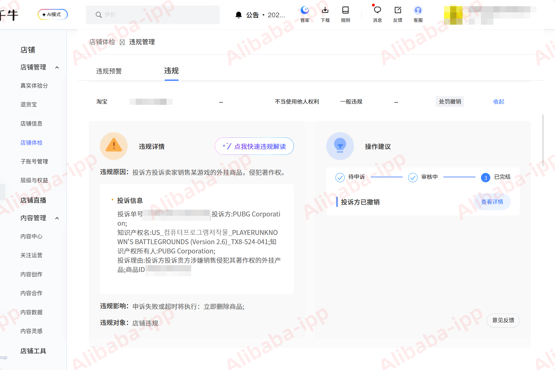 对于我们商家来说,运营一个爆款商品链接,往往倾注了无数心血。一天,一则来自淘宝平台的违规通知,让整个团队的心都提到了嗓子眼。通知显示,我们的商品被知识产权所有人:PUBG Corporation,依据其知识产权编号:TX8-524-041,名称为PLAYERUNKNOWN'S BATTLEGROUNDS的权利,以“著作权-不当-外挂”的违规类型发起了投诉。平台告知,若申诉不成功会导致商品链接被删除,甚至扣分。这款被投诉的游戏辅助工具,确实是我们店铺重要的流量和销量来源,一旦链接被删除,损失将难以估量。
