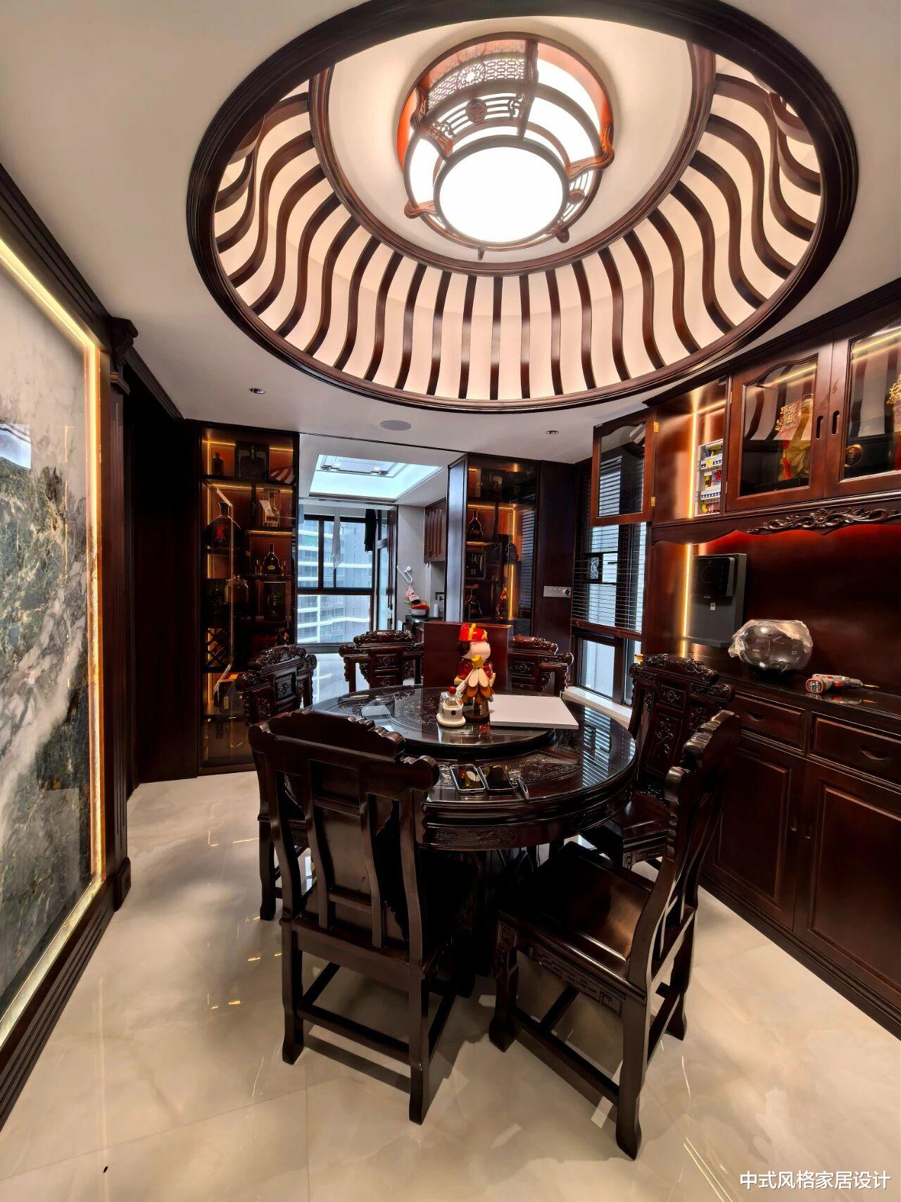 抬头望去,餐厅的圆顶与客厅的方顶相映成趣。这不是形式上的简单取舍,而是将“天圆地方”的古老宇宙观,化作可触摸的日常美学。圆,是餐桌上的团圆温暖;方,是客厅里的端方气度。在这方圆的流转中,家人相聚的温馨与待人接物的尺度,找到了最贴切的表达。