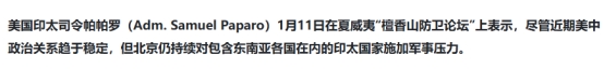 紧接着美军的动作,美国印太司令部司令帕帕罗1月11日在夏威夷“檀香山防卫论坛”上直接站出来说话,他没有绕弯子,而是指名道姓地提到了中国:虽然中美关系趋于稳定,但中方仍持续对包含东南亚各国在内的印太国家施加军事压力。