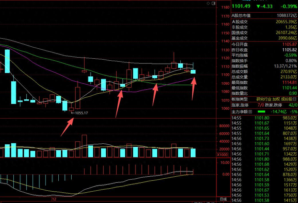 大盘今日小幅高开,全天围绕0轴横盘震荡,小幅收涨,11连阳收官。截止收盘,三大指数涨跌不一,上证涨0.09%,收报3968.84点;深证成指跌0.58%,收报13525.02点;创业板指跌1.23%,收报3203.17点。全市成交20659亿,较昨日21617亿缩量958亿。
