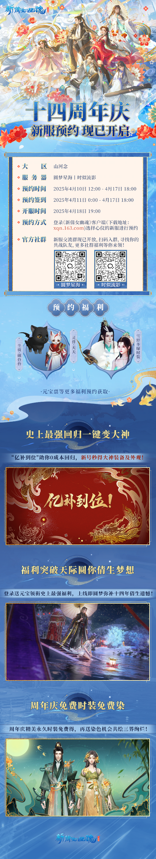 十四周年,是回顾往昔的温暖时刻,更是展望未来的崭新起点。新倩女幽魂的江湖永远为你敞开,无论你是初入三界的萌新,还是叱咤风云的老手,都能在这里找到属于自己的快乐。快来加入这场周年狂欢,畅享福利,续写属于你的江湖传奇!
