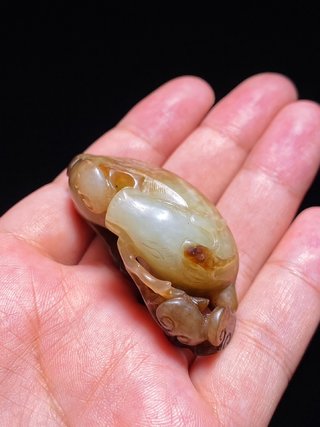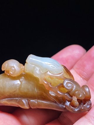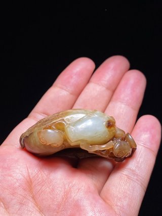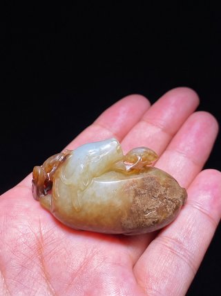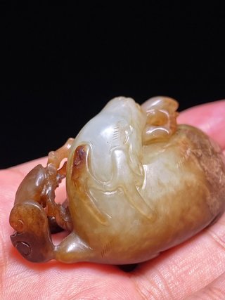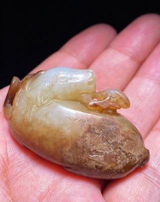 明 和田玉籽料沁色 鹿衔灵芝 把件 摆件 挂件 长6宽3高2.7厘米 重51克 瑞鹿衔灵芝为明清时期常见的吉祥题材,寓意“寿禄齐天”。整器圆雕一卧鹿,身躯圆润,四肢强健,蜷于腹下,腹背琢灵芝,嘴衔灵芝柄。鹿身一面薄留玉皮,复施轻微提色。全器线条流畅,工艺精良,玉质温润,可为书镇或案头陈设。