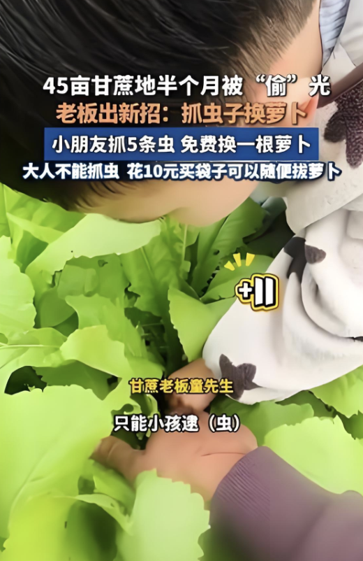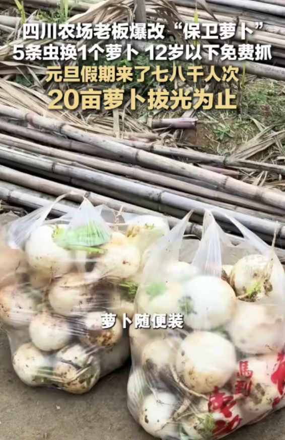 这场现实版“保卫萝卜”,可比手机游戏里的玩法更有野趣!不同于经典塔防手游的虚拟闯关,童先生把活动落地在自家农田里,玩法接地气又充满互动感。12岁以下的小朋友,只要捉满5条菜青虫就能免费兑换一根脆甜萝卜,既体验了农耕乐趣,又帮着地里除了虫;成年人花10块钱就能领个编织袋,进地随便拔萝卜,不少人铆足劲儿装满一袋,折算下来比菜市场还划算。更有意思的是隐藏玩法——游客们自发组队开启“防偷萝卜”挑战赛,你守我攻、互相“偷袭”,把田园变成了天然游乐场,氛围感直接拉满。