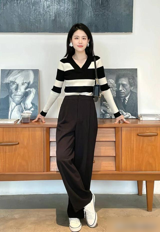 裤腿则走“空间感路线”:压褶西装裤的腰腹处有立体褶皱,藏住小肚腩还能凹出“沙漏腰”;牛仔直筒裤的裤线从胯部垂到脚踝,腿弯、假胯宽全被“一键拉直”。
