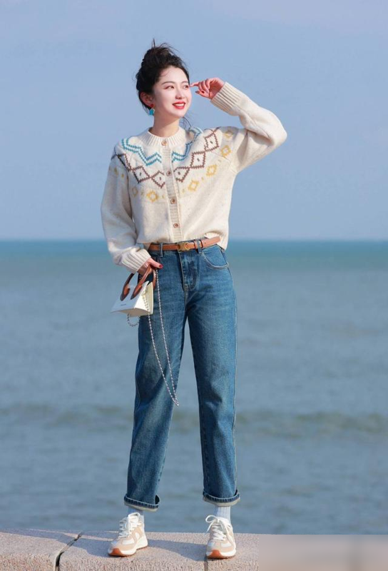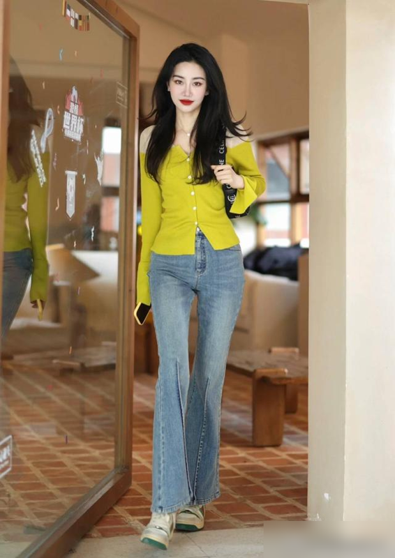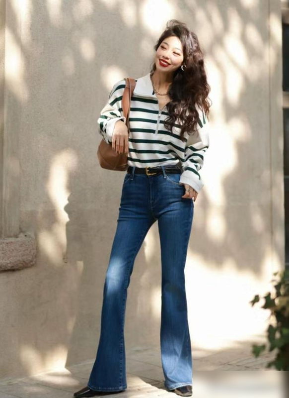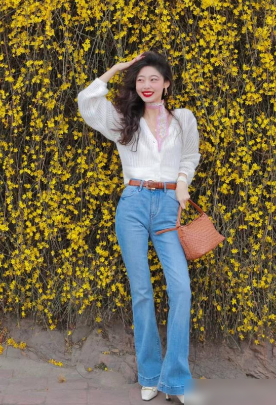 以前一条阔腿裤走天下,现在春季裤直接“分赛道”:职场人爱压褶西装裤,配衬衫塞衣角,干练得像“人间清醒”;学生党迷牛仔直筒裤,搭印花毛衣塞半角,青春得像“校园剧女主”;想走性感风的姐妹,微喇裤必须安排——上窄下宽的剪裁把腰臀曲线勾得刚刚好,搭镂空针织衫若隐若现,比露大腿更有氛围感。