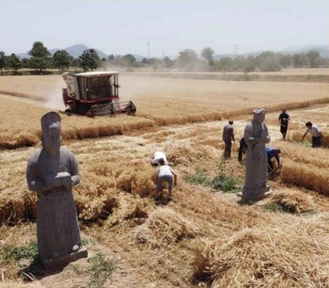 2022年6月1日,河南巩义。北宋皇陵永泰陵陵区内,当地村民在收割小麦。(图/CFP)