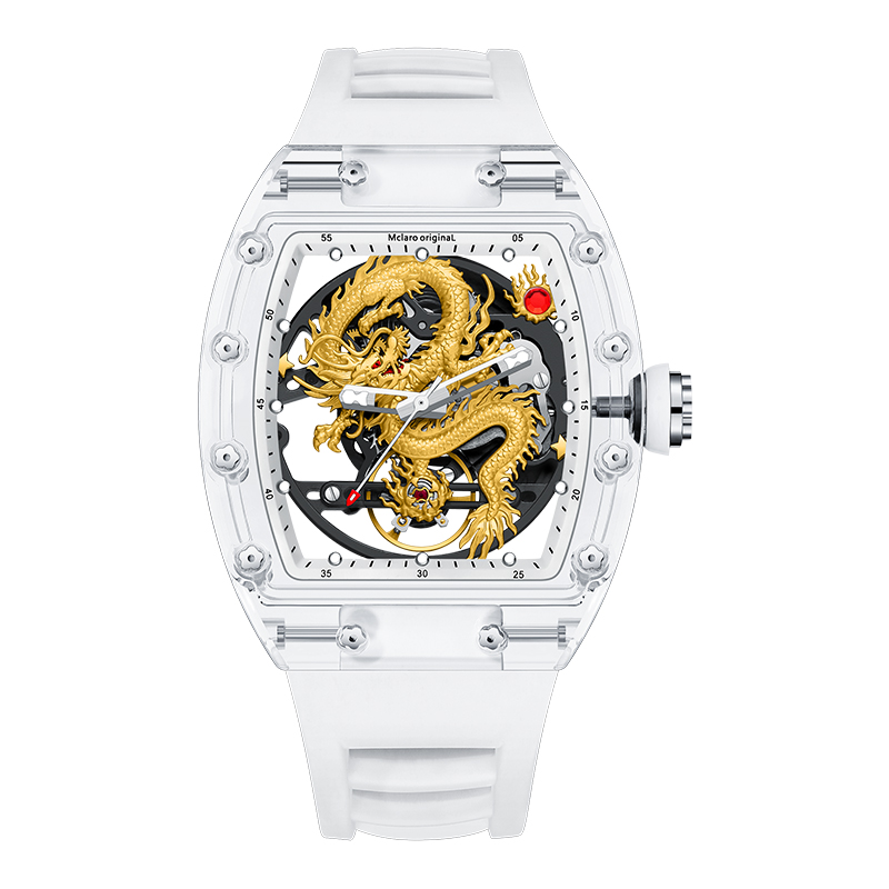 表盘中央,一条金色浮雕巨龙蜿蜒盘旋,凌空跃动,其鳞片、爪牙与神态刻画精致,呈现出极高的浮雕艺术水准。镂空机芯设计与龙形态相互交融,时间的律动仿佛为其赋予生命。表面采用水晶玻璃镜面,清澈通透,提升整体视觉层次感。全景天窗式的大背透令佩戴者能一览机芯内部结构,仿佛透视龙脉之源。搭配超强夜光指针与刻度,在夜间依旧清晰可读。生活防水设计则使这款腕表在实用性上同样值得信赖。