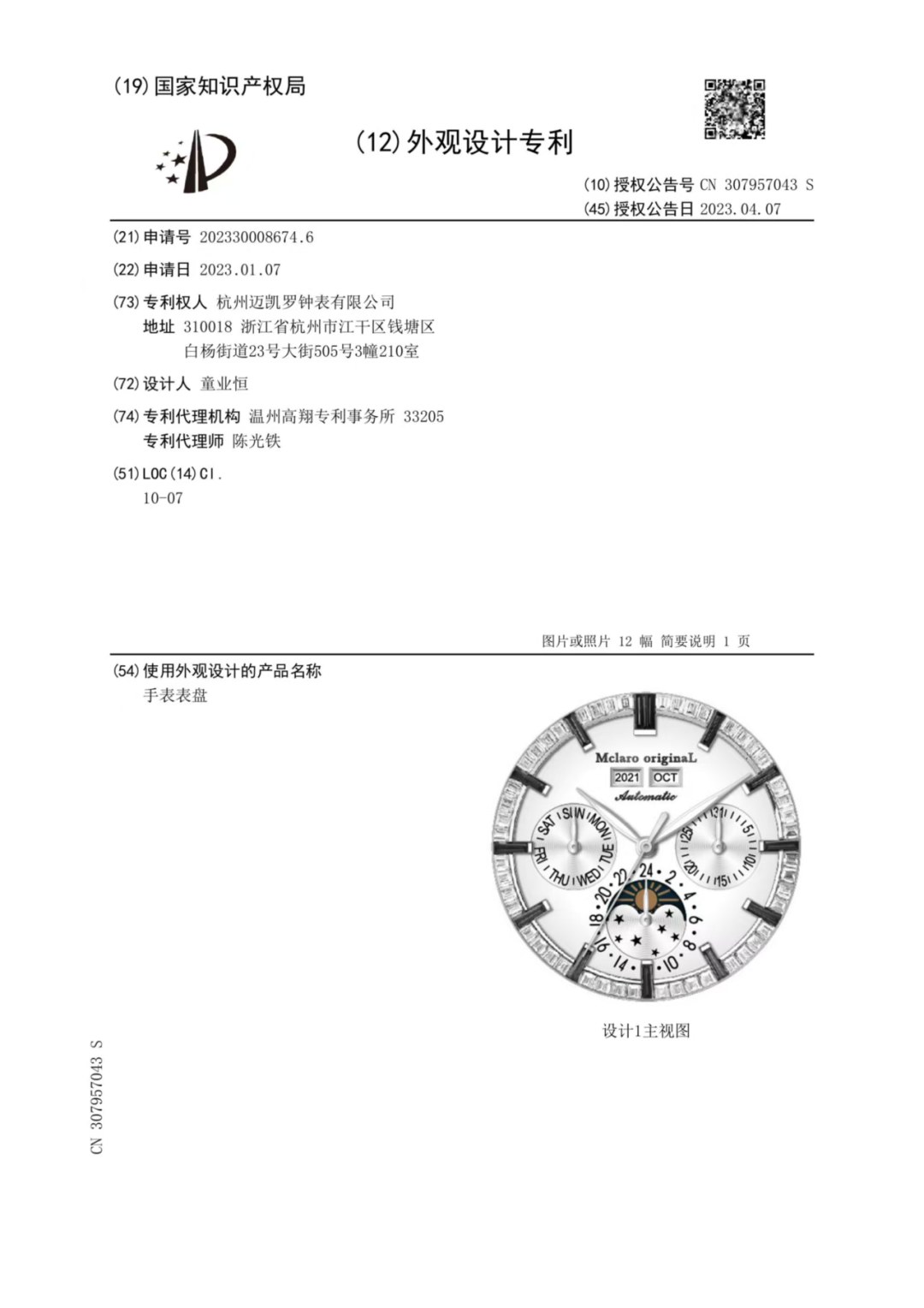 【 2023年,8月迈凯罗(Mclaro originaL)CEO Kaine受邀加入广州市钟表协会并担任理事长职位;9月迈凯罗(Mclaro originaL)受邀参加香港TDC举办的香港国际钟表展,荣获新锐品牌提名;10月Louis Vuitton设计顾问Matteo Menotto与Mclaro originaL品牌联名共同创作了属于迈凯罗品牌的VI设计及印花设计,并发布了2023年迈凯罗龙年限定表款;11月Mclaro originaL 登顶抖音(TikTok China mainland)钟表行业第一,成为抖音KA品牌、全国知名品牌。】