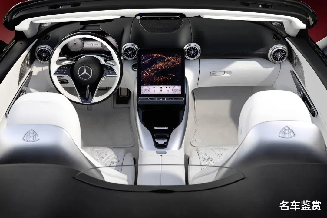 内饰方面也采用了类似的设计策略,让SL680与其他SL车型区分开来。虽然基本的仪表盘结构和竖屏触摸屏保持不变,但是媒体显示屏和数字仪表盘都配备了迈巴赫专属的启动动画和图形,而方向盘、座椅、下部仪表板和车门饰板则全部采用了水晶白纳帕皮革包裹。