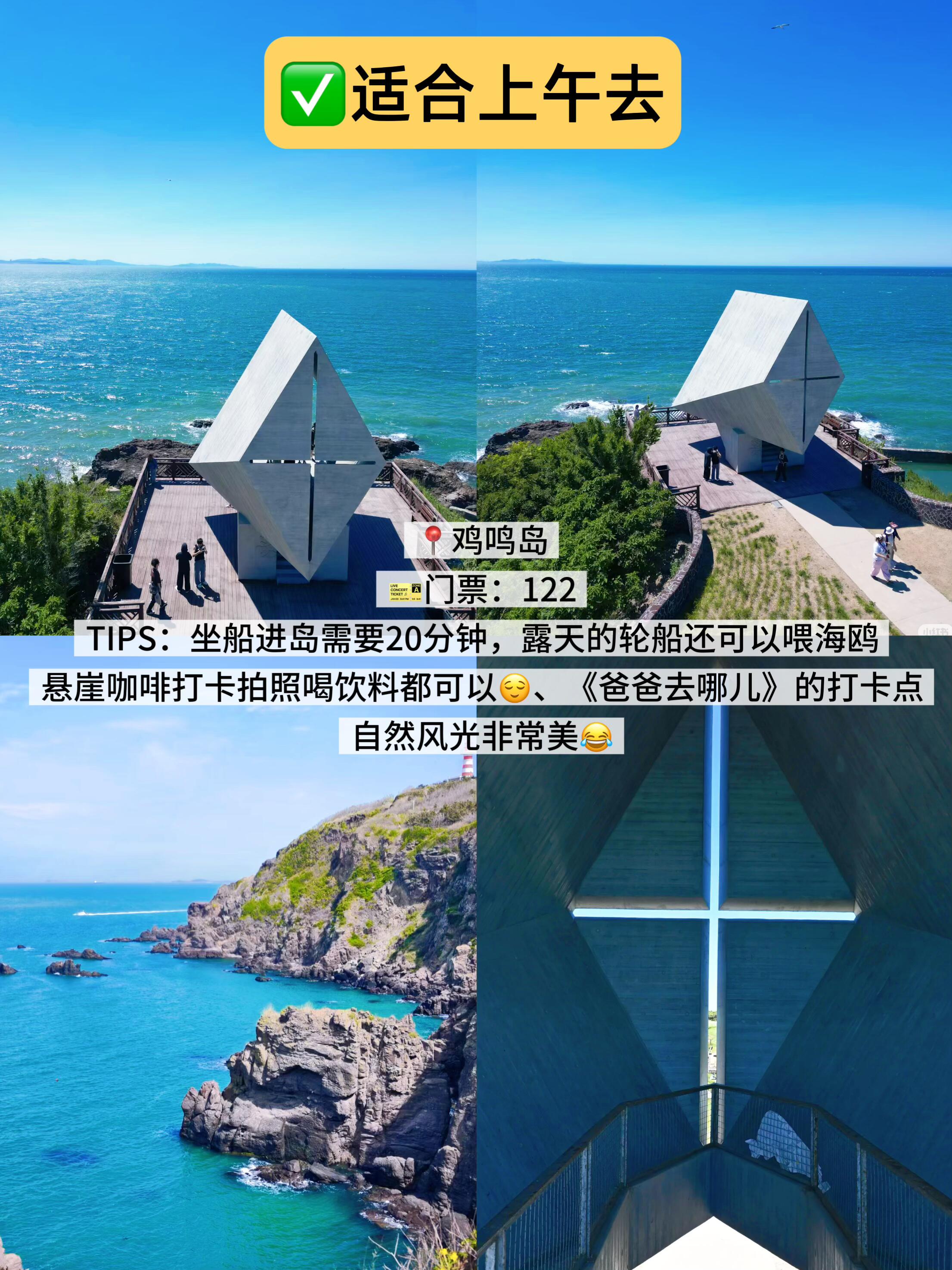 🎫门票:122TIPS:坐船进岛需要20分钟,露天的轮船还可以喂海鸥,悬崖咖啡打卡拍照喝饮料都可以😌、《爸爸去哪儿》的打卡点、自然风光非常美😂