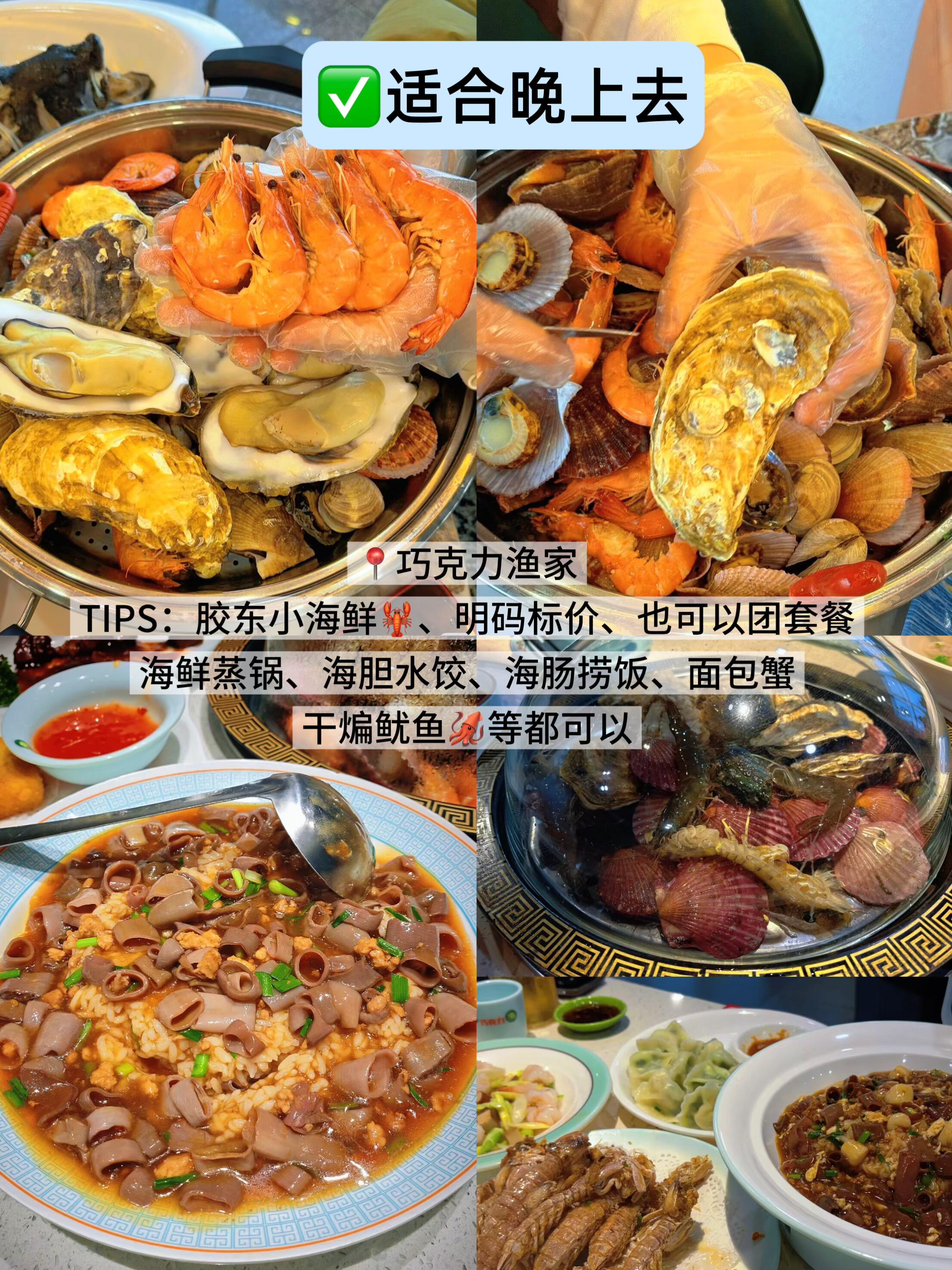 TIPS:胶东小海鲜🦞、明码标价、也可以团套餐,海鲜蒸锅、海胆水饺、海肠捞饭、面包蟹,干煸鱿鱼🦑等都可以😌