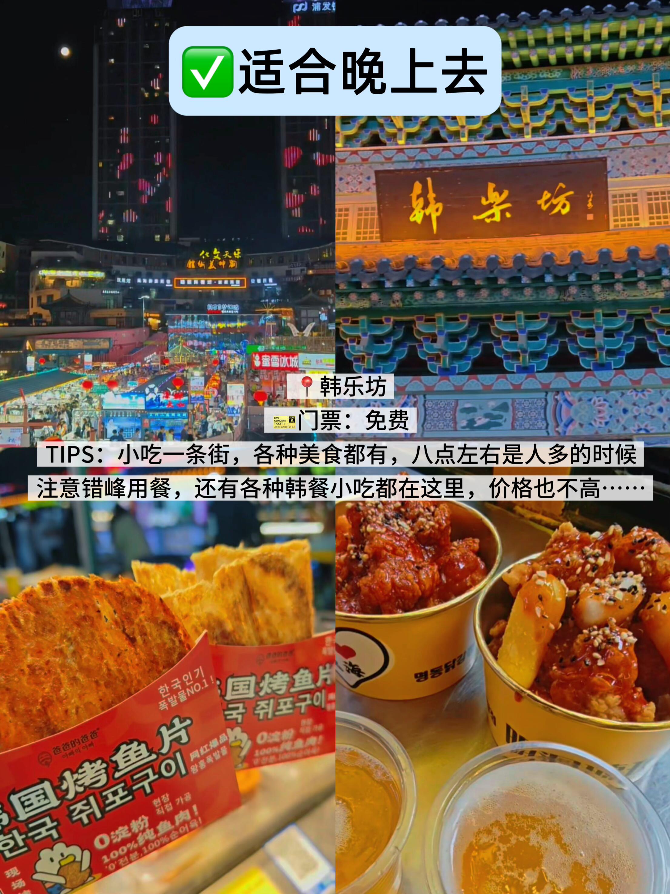 TIPS:小吃一条街,各种美食都有,八点左右是人多的时候,注意错峰用餐,还有各种韩餐小吃都在这里,价格也不高……