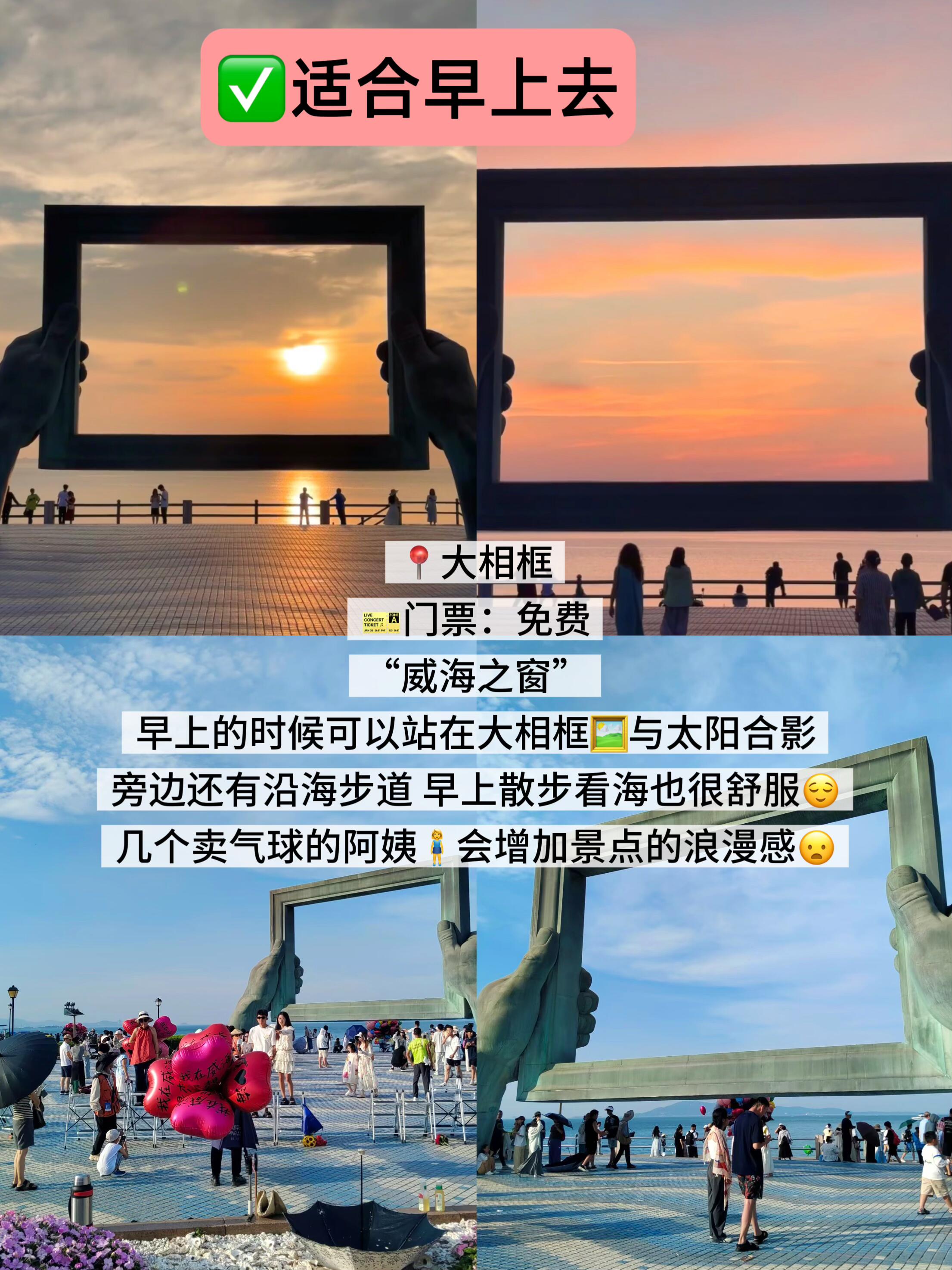“威海之窗”早上的时候可以站在大相框🖼️与太阳合影,旁边还有沿海步道 早上散步看海也很舒服😌、几个卖气球的阿姨🧍♀️会增加景点的浪漫感😦