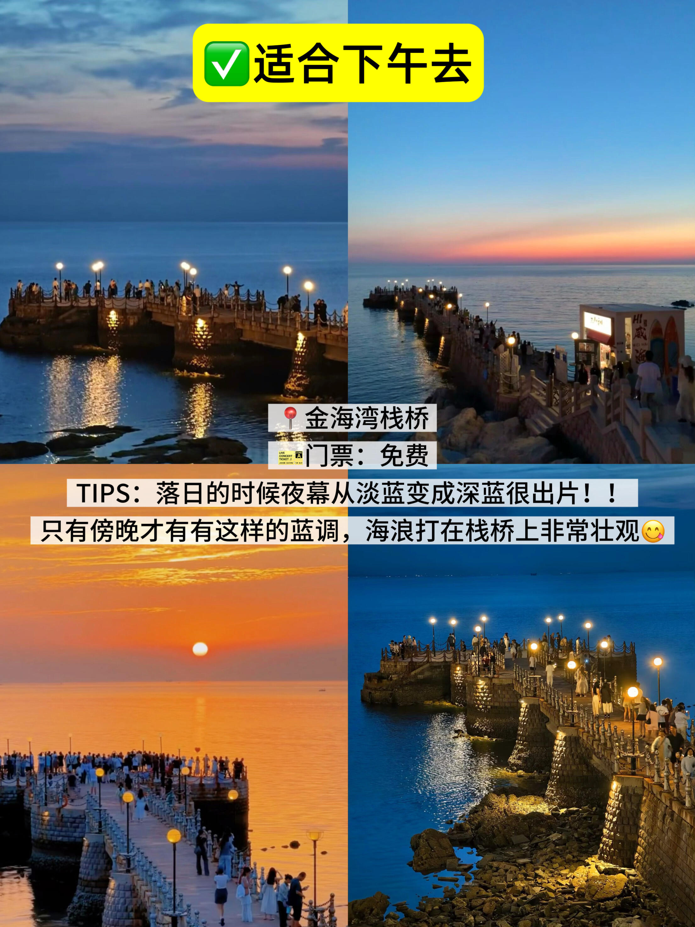 TIPS:落日的时候夜幕从淡蓝变成深蓝很出片!!只有傍晚才有有这样的蓝调,海浪打在栈桥上非常壮观😋