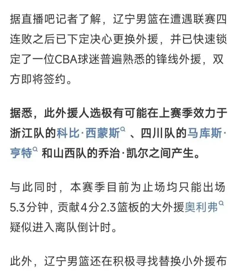 本赛季CBA的比赛已经打到了第9轮了,目前辽篮拿到了4连败排名持续下跌,开创了队史的最差开局。原因之一就是选的外援太拉垮,打不了硬仗。今日有媒体人爆料,辽篮接下来将要更换外援了,大概率会裁掉奥利弗和布朗两人,用其他的外援来替代他们。据说杨鸣这次瞄准了CBA的3名老熟人,他们就是凯尔三世、科比西蒙斯和马库斯·亨特3人。