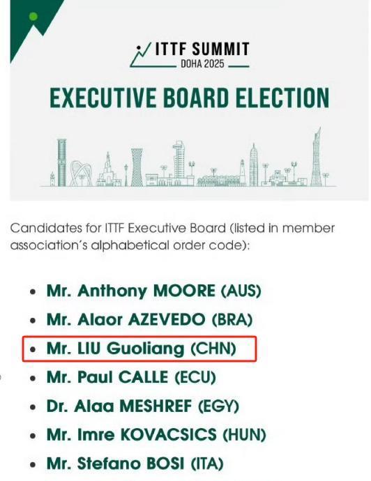 根据国际乒联的安排,多哈世乒赛后将进行执委选举,刘国梁正式参与竞选。