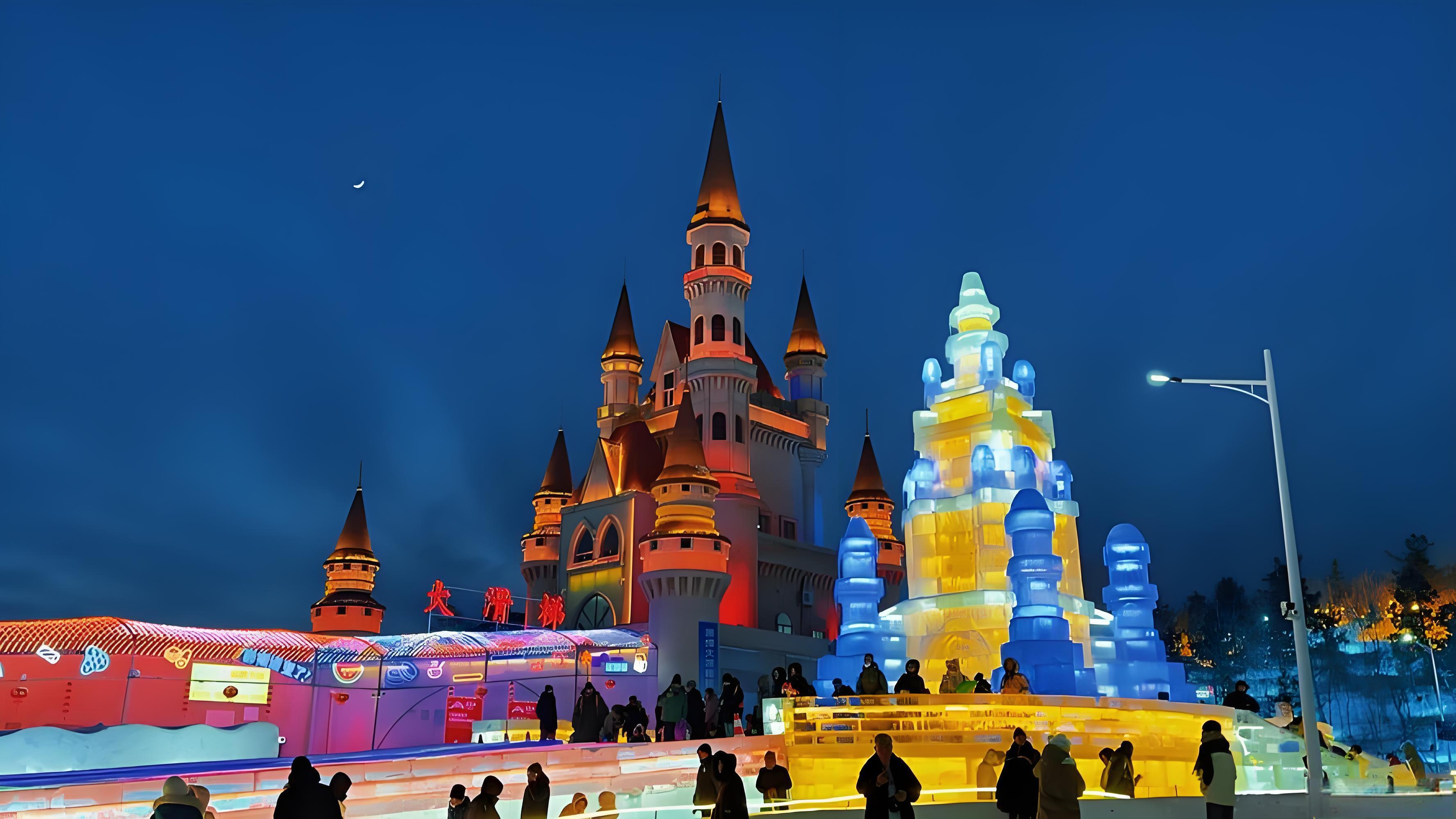 156 万平方米的长春冰雪新天地,宛如一座梦幻般的天然舞台,为此次活动增添了无与伦比的绝美背景。520 米的冰滑梯宛如一条闪耀的巨龙,冰雪花果山、龙宫等景点在灯光的映照下如梦如幻,仿佛将人们带入了一个奇妙的冰雪童话世界。从航拍镜头俯瞰,这些冰雕雪塑构成的景观犹如一幅巨大的冰雪画卷,美不胜收。