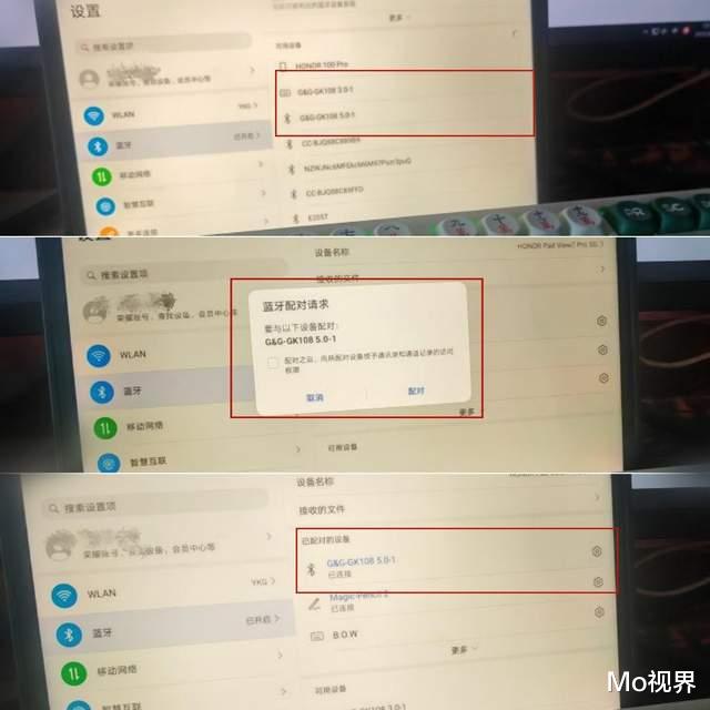 基本所有的蓝牙配对都是相同的招数:打开双方蓝牙→找到正确的蓝牙配对名称→点击等待配对→点击蓝牙配对请求(确认)→配对成功。当然了,因为这款格之格GK108是属于108键的大键盘,相对较重,所以更多的情况下我还是使用接收器连接电脑使用。毕竟平板偶尔带出去玩,这个键盘又重又大就有点不那么方便了。