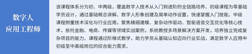 数字人应用领域的技能学习可分为初中两级,初级阶段侧重数字人形象创建、基础动作设置,中级阶段则深入精细建模、智能语音交互优化,且通常会结合金融、电商等实际场景进行实战练习,比如设计直播间数字人助手等应用。
