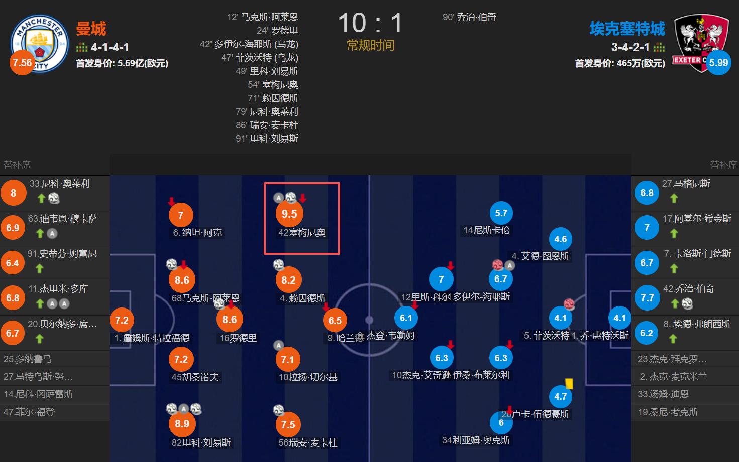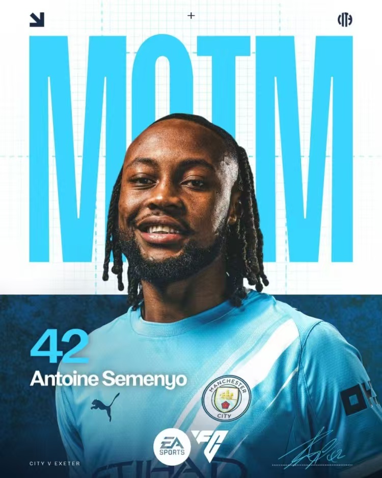 本周六,足总杯第3轮,曼城10-1狂胜英甲球队埃克塞特城,塞梅尼奥代表曼城首发出战,比赛第64分钟被换下,传射建功。曼城一场大胜,塞梅尼奥迎来了曼城生涯的首秀+首球+首助,赛后当选此役官方最佳球员(MVP)。此役,塞梅尼奥的数据除了传射建功之外,1次成功过人,2次关键传球,传球成功率高达92.7%。赛后,媒体给塞梅尼奥打了9.5分的全场最高分。