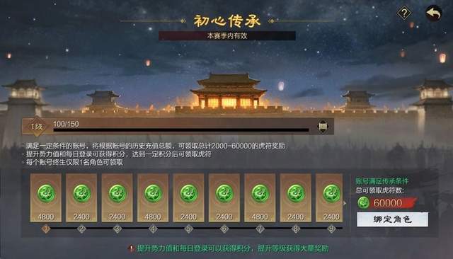 而且,不仅现有玩家和新玩家奖励多多,在玉玺主题服,还专门为回归玩家准备了"初心传承"活动。只要你在9月24日到10月7日期间没登录过,回归后根据账号情况,最高可领60000虎符!就算是纯新号,进入经典服玉玺联动主题服也能保底拿2000虎符,最快一周就能领完全部奖励。