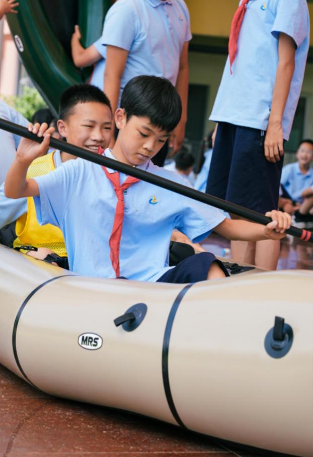 在体验过程中,同学们热情高涨,积极尝试与水亲密接触。他们在教练的指导下,或是轻轻划动船桨,或是兴奋地研究背包船的构造与使用方法。